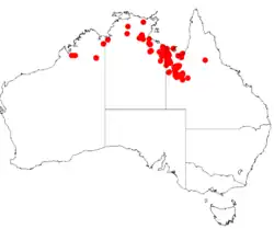 This species of wattle grows in shallow, stony soils and is found from the eastern Kimberley region of Western Australia through the north of the Northern Territory to far north-western Queensland.[2][3][4][9]