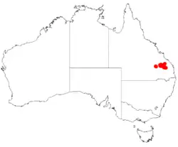 This species of wattle is endemic to an area around Cracow in south eastern Queensland in the Dawson River catchment.[2][4] It is found on the lower slopes of steep sandstone hills and ridges growing in sandy to sandy-clay soils as a part of dry sclerophyll forest communities as is often associated with species including Corymbia maculata, C. trachyphloia, Eucalyptus crebra, E. cloeziana, E. citriodora, C. tesselaris, Angophora leiocarpa, Lysicarpus angustifolius, Acacia podalyriifolia and A. crassa.[5]