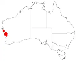 This species of wattle is native to near-coastal areas between Zuytdorp Cliffs and Watheroo where it grows in sand in heath, shrubland and low open woodland in the Avon Wheatbelt and Geraldton Sandplains bioregions of south-western Western Australia.[2][3][4]