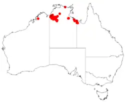 This species of wattle is found through the top end of the Northern Territory[8] and a small part of north western Queensland where it grows in stony and sandy soils usually on laterite or quartzite in Eucalypt woodlands or scrubby open forest communities.[2][3] It is also found in Western Australia where it is found in the Northern Kimberley and Victoria Bonaparte bioregions on sandstone outcrops above creek beds.[9]