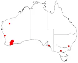 This species of wattle is native to the Esperance Plains, Mallee and Swan Coastal Plain bioregions of south-western Western Australia where it commonly grows on undulating sandplains and flats in sandy-clay, loamy-clay or clay soils.[8] It is scattered but locally common between Karlgarin, Gnowangerup, Chillinup Nature Reserve and Jerramungup in low Eucalyptus woodland or open shrub mallee communities.[4]