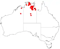 This species of wattle is endemic to tropical areas of the Northern Territory where it often grows in colonies in stony, sandy soils, or in alluvium, in grassland, shrubland, woodland or tall wet forest, along creeks, on hills or in gullies.[2][3][4]