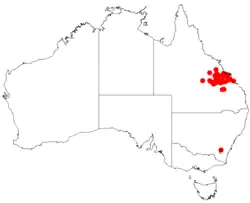 This species of wattle occurs in Queensland along the Great Dividing Range between Mara and Moranbah and is common on the Blackdown Tableland, where it grows in open forest in sandy, gravelly or loamy soils, usually over sandstone.[2][3][4]