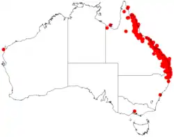 It is endemic to the coastal regions of Queensland and northern New South Wales extending into the adjacent tablelands of the east in northern Queensland.[1] In New South Wales it occurs as far south as the Bellinger River where it is found along the edges of rainforest and behind coastal sand dunes as a part of wet sclerophyll forest and sclerophyll woodland communities.[2]