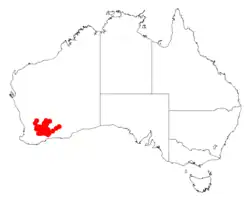 It is native to an area in the Wheatbelt and Goldfields-Esperance regions of Western Australia that is found on stony ridges, lateritic rises and undulating plain growing in sandy-clay-loam soils.[1] The bulk of the population is found between Bencubbin in the north to around Lake Grace and Lake King as a part of mallee shrubland or open woodland communities.[2]
