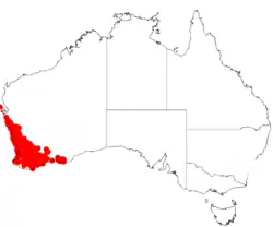 It is native to an area in the Wheatbelt, Goldfields-Esperance and Great Southern regions of Western Australia[3] with the bulk of the population found south west of a line from Kalbarri to Esperance.[4] The plant is found in a range of habitat including in seasonally damp areas, in and around swamps, on flats and coastal dunes an can grow in a variety of soils.[3]