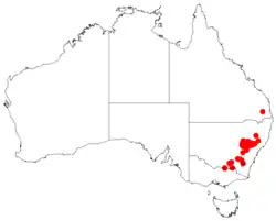 It is native to an area in the upper Hunter Valley[2] of New South Wales from around Scone and Denman, New South Wales in the east to around Gulgong in the east with southerly outliers around Wagga Wagga. It is often found growing on the lower portions of sandstone hills in colluvial rocky sandy soils[1] where it is often a part of dry sclerophyll forest and woodland communities.[2]