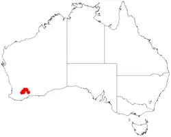 It is native to an area in the southern Wheatbelt region of Western Australia where it is found growing in sandy or gravelly loam soils.[1] The shrub has a limited distribution and is confined to an area between Lake Grace, Lake King and Hyden where it is usually a part of open scrub, open heathland or low open woodland communities.[2]
