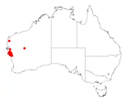 It is native to Mid West region of Western Australia from around Northampton in the north down to around Geraldton in the south. The plant is often situated on rises and rocky plains and will grow in sandy and clay soils and on sandstone.[1] It is commonly situated in coastal areas from around Eradu in the south east up to Kalbarri National Park in the north in soils over gravel or sandstone, ironstone and limestone as a part of sandplain shrubland communities often along with Calothamnus and Melaleuca species.[2]