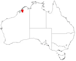 It is native to a small area in the west Kimberley region of Western Australia.[2] A few populations of the plant are known and are spread over a distance of about 100 km (62 mi) from around the Sale River, Synnott Range, Edkins Range and Mount Daglish where it is often situated between sandstone ridges growing in shallow sandy soils as a part of open low woodland communities where it is sparsely distributed.[1]