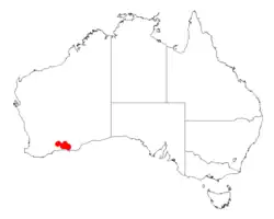 It is native to an area in the Wheatbelt and Goldfields-Esperance region of Western Australia extending from around Lake Grace in the north west to around Esperance in the south east where it is commonly situated on flats growing in clay to loamy or sandy-loamy soils.[1] The bulk of the population is located from around Frank Hann National Park and Peak Eleonora to the south of Norseman in the north to around Mount Ridley to the north of Esperance in the south east where it is a part of open dwarf shrub, shrub mallee or low heath communities.[2]