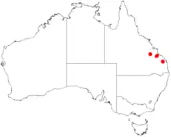 It is endemic to south-eastern Queensland around Biggenden and is also present on the Blackland tableland where it is found on steep rocky slopes[1] and hilly terrain growing in stony and sandy soils. It is usually a part of woodlands, shrublands or heathland communities mostly in rocky areas or pavements. Associated species of trees found with A. pubicosta include Eucalyptus crebra, Eucalyptus acmenoides and Corymbia citriodora.[2]
