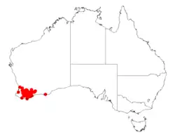 It is native to an area in the Wheatbelt, Great Southern, South West and Goldfields-Esperance regions of Western Australia where it is found growing in sandy or loamy soils derived or containing laterite.[1] The range of the plant extends from around Narrogin in the north west to Rocky Gully in the south west out to Beaufort Inlet in the south east and Lake King in the north east as a part of many communities but most often in Mallee shrubland or open Eucalyptus wandoo woodlands.[2]
