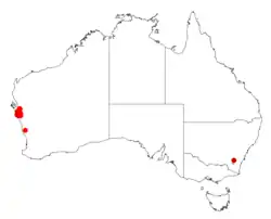 It is native to an area between Northampton and Shark Bay in the Mid West region of Western Australia where it is found on sand plains and sandhills growing in sandy clay soils over limestone or laterite.[1] The shrub is usually part of a heath or shrubland communities.[2]