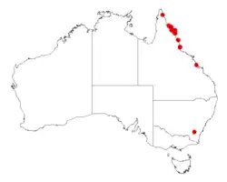It is native to coastal areas in north eastern Queensland where it has a scattered distribution from around Bathurst Bay in the north down to around Cooktown in the south with other outlying populations around Cairns and on Hinchinbrook Island. It is found growing in sandy soils as a part of open forest and heathland communities.[1]
