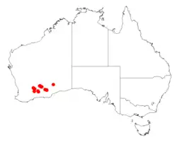 It is native to an area in the Wheatbelt and Goldfields-Esperance regions of Western Australia where it is often situated on flats and low hills growing in rocky calcareous loamy or sandy soils.[1] It has a scattered distribution from around the Parker Range in the west to around Kanandah Station in the east where it is often found as a part of open Eucalyptus woodland communities.[2]