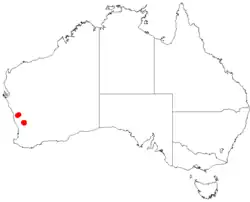 It is native to a small area in the Wheatbelt region of Western Australia where it is commonly situated on hillslopes growing in gravelly lateritic soils.[2] It has a very limited range in the Wongan Hills area where it is thought to be an opportunist in disturbed areas that is long living. It is usually found as a part of Mallee and acacia shrubland communities, and often found with Allocasuarina campestris, Petrophile shuttleworthiana, Eucalyptus longicornis, Acacia acanthoclada, Acacia lasiocarpa and Acacia pulchella.[1] In 2006 there was an estimated 10,400 mature individual plants situated within fifteen separate populations found over an area of approximately 60 km2 (23 sq mi).[4]