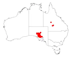 It is endemic to southern parts of central South Australia from the northern parts of the Eyre Peninsula in the south to around areas to the west of the Gawler Range and to just north of Tarcoola where it is usually situated on rocky hillsides and ridges that are composed of granite as a part of open and tall shrubland or low woodland communities.[2] It is often associated with other species of Acacia including Acacia aneura, Acacia cibaria and Acacia papyrocarpa growing in shallow compact loamy soils and alkaline red duplex and brown calcareous soils in areas where the average rainfall is 200 to 350 mm (7.9 to 13.8 in) per annum.[3]