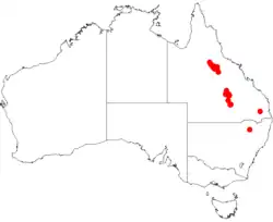 It is endemic only in a small area in Queensland from the White Mountains to Torrens Creek and the headwaters of the Nogoa River where it is found on plains and hills where it grows in sandy soils over and around sandstone as a part of open forest or woodland communities composed of Angophora and Eucalyptus species.[1]