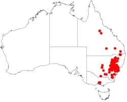 It is found in the north eastern part of Mount Kaputar National Park in New South Wales where it grows along watercourses and on hillsides Eucalyptus and Callitris woodland communities in rocky sandy-loam soils.[2]
