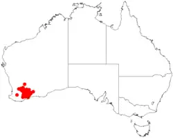 It is native to an area in the Wheatbelt and Great Southern regions of Western Australia where it is often found in low-lying areas usually around ricers, creek and swamps growing in sandy, clay or loamy soils.[3]