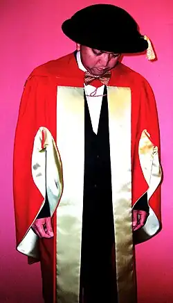 Academic regalia at McGill was traditionally differentiated in accordance with the wearer's status and degree.[8] Matriculating undergraduates had to attend classes in "plain, black stuff gown, not falling below the knee, with round sleeve cut above the elbow".[6] Graduating students for the bachelor's degree, on the other hand, wore robes falling below their knees with full sleeves cut to the elbow, and black hoods lined in silk which were edged with white rabbit fur. Master's degree candidates/holders wore the same black gown as the bachelor's, with the masters' sleeves appearing in semi-circular cut toward the bottom. Doctors of Philosophy (Ph.D.s), Science, Literature, and Civil Law wore the university's scarlet full dress. The doctoral full dress was the equivalent of the academic dress of the University of Cambridge for its higher doctorates, rather than for its Ph.D.s.[9] It was originally made of scarlet cloth, "faced with silk of the same colour as the lining of their respective hoods."[10] The turned-back, full sleeves of the McGill doctoral dress were also lined up with silk in the same colour that denoted the wearer's field of study. Doctorate and master's hoods were identical in form. They were distinguished from the bachelor hoods by the former's scarlet colour, greater length and absence of rabbit fur.[11] McGill University's official colour is scarlet.[12]