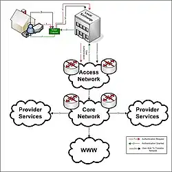 An access network is a type of telecommunications network which connects subscribers to their immediate service provider. It is contrasted with the core network, which connects local providers to one another. The access network may be further divided between feeder plant or distribution network, and drop plant or edge network.