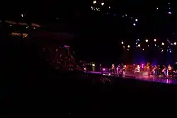 Industry observers thought the tour might have to be postponed or at least downsized to smaller venues,[3] as for example Mariah Carey did on her 2003 Charmbracelet World Tour, but in the end the Chicks initially kept on schedule and stayed in arenas. Some Northeastern areas did better, and shows in Canada did best, with an Air Canada Centre show in Toronto selling out almost immediately, resulting in a second show being added and Calgary's Saddledome having two shows as well in Winnipeg at the MTS Centre.[3] Meanwhile, the tour began. The Chicks first performed a quick mini-leg of two concerts in London as part of their promotional activities for the June 12 international release of Taking the Long Way. Indeed, their first concert performance in almost two years (since October 2004's Vote for Change shows) was on June 15 at the Shepherd's Bush Empire, the so-called "scene of the crime" of Maines' remark regarding President Bush. In a show that was broadcast live by MSN and called "Scene of the Crime", Maines said from the stage, "And all week, the only thing people keep asking is, 'What are you gonna say? Do you know what you're gonna say?' As usual I didn't plan anything, but I thought I'd say something brand new and just say, 'Just so you know, we're ashamed the President of the United States is from Texas.'" This was met with thunderous applause and cheers.[4]
