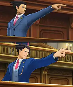 The first thing Fuse and his art team had to do was figuring out how to create 3D models that preserve the look and feel of the previous games' 2D sprites, even when viewed in stereoscopic 3D. Some of the artists on the team created a concept trailer for how the game's visuals would work, featuring a 3D model of Phoenix. Looking back at it, Fuse called the model "cringe-worthy", but it was able to be used as a base. Everyone on the development team gave feedback on the model, and it was continuously refined until everyone was satisfied with its look;[20] this process alone took six months.[13] The art team also wanted to preserve the "lively" style of animation used in the 2D sprites.[20] To do this, they used "various tricks" such as using different character models for different angles.[13] They also took advantage of the increased capabilities of the Nintendo 3DS hardware, and added camera movements and connecting animations to give the character animation further fluidity.[20]