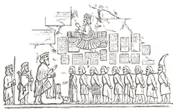 Architecturally speaking, the Behistun inscription is a massive project, that entailed cutting into the rough edge of the mountain in order to create bas-relief figures as seen in the pictures above. The Behistun mountain, rises up to some 1700 feet as part of the Zagros mountain chains in Iran. The mountain's location is ideal being close to both Ecbatana and Babylonia.[38] The bas-relief itself is located some 300 feet above the base of the mountain. The figures represent two of the king's soldiers, the king himself standing over a fallen usurper and captives of several nations possibly dissidents, or co-conspirators. The inscription itself is written in cuneiform character in Old Persian, Babylonian, and Median.[38]