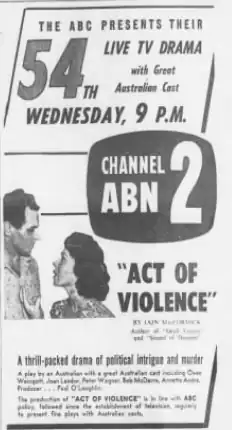 Act of Violence is a 1959 television play broadcast by the Australian Broadcasting Corporation. It was based on a play by Australian writer Iain Mac Cormick which had previously been broadcast in Britain in 1956. This was typical of Australian television at the time - most locally produced drama consisted of adaptations of overseas stories.[2] Act of Violence aired live on 25 March 1959 in Sydney[3] and on 1 April 1959 aired a taped version in Melbourne[4][5]