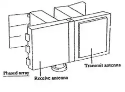 An active electronically scanned array (AESA) is a type of phased array antenna, which is a computer-controlled antenna array in which the beam of radio waves can be electronically steered to point in different directions without moving the antenna.[1] In the AESA, each antenna element is connected to a small solid-state transmit/receive module (TRM) under the control of a computer, which performs the functions of a transmitter and/or receiver for the antenna. This contrasts with a passive electronically scanned array (PESA), in which all the antenna elements are connected to a single transmitter and/or receiver through phase shifters under the control of the computer. AESA's main use is in radar and these are known as active phased-array radar (APAR).