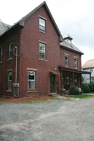 The Addison Prentiss House is located east of downtown Worcester, at the end of Channing Way, a stub street off Channing Street in the city's Bell Hill neighborhood. It is a 2+1⁄2-story brick building with an L-shaped configuration and gabled roof. It is oriented facing south toward Kendall Street. The main facade is dominated by a 3+1⁄2-story tower, and a porch that extends across the full width of the front. Other elevations are asymmetrical, with varying gables and porches. Windows are generally set in rectangular openings, with rustically cut granite sills and lintels. A wood frame porch extends across the northern facade, which appears to have served as the building's principal entry.[2]