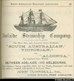 Its promoters and founding directors included Andrew Tennant,[20] Robert Barr Smith[21] and Thomas Elder[22] of Elder Smith & Co Ltd. The first ship of the new company was Flinders.[23] In July 1876 the company's leading promoters amalgamated their private ship-owning interests to form the Spencer's Gulf Steamship Co Ltd, trading in South Australian coastal waters. The two companies amalgamated in December 1882.[24] The fleet circled the coast from Derby in northern Western Australia to Cairns in northern Queensland.[23] Shipping operations were supported by a large network of agency offices in almost every major Australian port.[3]