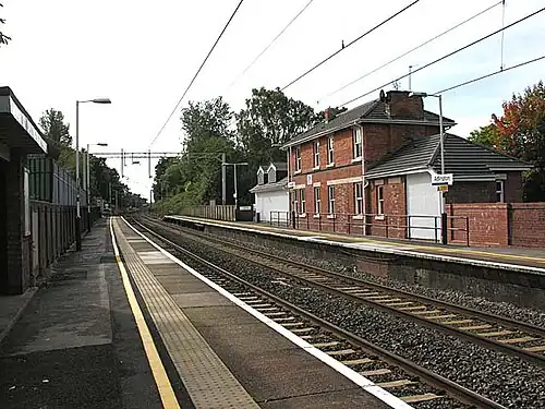 Adlington (Cheshire) railway station serves the village of Adlington, in Cheshire, England. It is a stop on the Stafford-Manchester line, a spur of the West Coast Main Line.