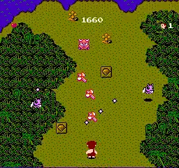 Adventures of Dino Riki was developed by Hudson Soft. Previews in Japanese magazines revealed that it was initially an action game with unique mechanics before being reworked into a scrolling shooter mere months before launch.[4] In this earlier incarnation the player would have scrolled to different screens by following the direction indicated by an arrow.[5] The objective on each screen would be to pick up three flowers while battling enemies, who would have to be stunned with stones then kicked offscreen.[6][7] The player could still uncover item tiles which would have included additional power-ups for moving over different terrain, a stopwatch for freezing enemies, and others. It would have consisted of 16 stages with a boss on every fourth stage.[6] Features such as a day/night cycle and bonus stages were also shown.[6][7]