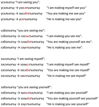 | Toward the head | шъхьары~ [ʂħaːrə~] | шъхьарыплъы [ʂħapapɬə] "(s)he is looking at the head" |