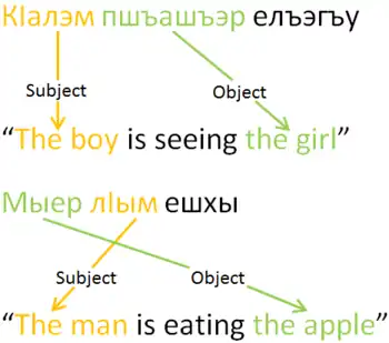 кӏалэр пшъашъэм еплъа е кӏалэм пшъашъэр къеплъа? кӏалэ-р пшъашъэ-м еплъ-а е кӏалэ-м пшъашъэ-р къ-еплъ-а? [t͡ʃʼaːɮar pʂaːʂam japɬaː ja t͡ʃʼaːɮam pʂaːʂar qajpɬaː] boy (abs.) girl (erg.) is (s)he looking at it? or boy (erg.) girl (abs.) is (s)he looking at it? "Is the boy looking at the girl or is the girl looking at the boy?"