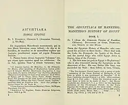 The Aegyptiaca (Koine Greek: Αἰγυπτιακά, Aigyptiaka, "History of Egypt") was a history of ancient Egypt written in Greek by Manetho (fl. 290 – 260 BCE), a high priest of the ancient Egyptian religion, in the early 3rd century BCE at the beginning of the Ptolemaic Kingdom of Egypt.[1] As an Egyptian intellectual who wrote in Greek about his civilization's very long history—over two thousand years old when he wrote his history—Manetho mediated Egyptian and Greek cultures at the dawn of the Hellenistic period. His Aegyptiaca was a comprehensive history of ancient Egypt and stands as a unique achievement in the corpus of ancient Egyptian literature. It continues to be a vital subject in Egyptology, and an important resource in the refinement of Egyptian chronology.[2][3]