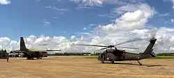 A Royal Thai Air Force G.222 during an emergency evacuation exercise at COBRA GOLD '01, with a US Army UH-60Q Black Hawk helicopter