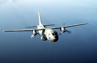 The G.222 is a twin turboprop-engine tactical military transport aircraft, and is designed to be capable of transporting equipment or troops in combat zones and operating with minimal ground support.[12] Early production aircraft were exclusively fitted with the General Electric T64-GE-P4D turboprop engine, the licence-built Rolls-Royce Tyne was made available as an alternative powerplant for the type from 1980 onwards, while the Allison T56 was another proposed powerplant for the type.[7][9] Due to features such as double-slotted flaps, stacked brakes, and reversible propellers,[19] the G.222 has excellent short landing capabilities and is able to land in as little as 1,800 feet.[20] It was designed to be integrated with the larger, commonplace Lockheed C-130 Hercules.[5]