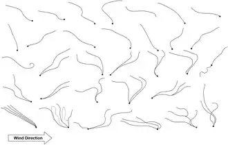 Ballooning, sometimes called kiting, is a process by which spiders, and some other small invertebrates, move through the air by releasing one or more gossamer threads to catch the wind, causing them to become airborne at the mercy of air currents.[64][65] A spider (usually limited to individuals of a small species), or spiderling after hatching,[66] will climb as high as it can, stand on raised legs with its abdomen pointed upwards ("tiptoeing"),[67] and then release several silk threads from its spinnerets into the air. These automatically form a triangular shaped parachute[68] which carries the spider away on updrafts of winds where even the slightest of breezes will disperse the arachnid.[67][68] The flexibility of their silk draglines can aid the aerodynamics of their flight, causing the spiders to drift an unpredictable and sometimes long distance.[69] Even atmospheric samples collected from balloons at 5 km (3.1 mi) altitude and ships mid-ocean have reported spider landings. Mortality is high.[70]