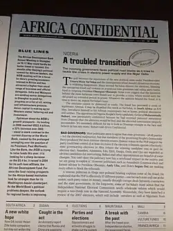 Africa Confidential is a fortnightly newsletter covering politics and economics in Africa. It was established in 1960[1] and is owned by the British company Asempa Limited. Founded by a group of six individuals under the banner of Miramoor Publications, Africa Confidential was originally printed on blue airmail paper and was thus nicknamed "The Blue Sheet". It is available by subscription only.