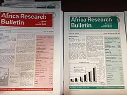 The Africa Research Bulletin is a peer-reviewed academic journal, appearing in two series - Political, Social and Cultural Series, and Economic, Financial and Technical Series. The journal was founded in 1964 by John Drysdale, a former British diplomat and historian, who also established its sister publication, the Asia Research Bulletin.[1]