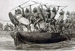 In the Niger Delta, the bigger Itsekiri war canoes mounted multiple cannon and swivels, and carried 40 rowers and 100 warriors, with slaves doing most of the rowing duties. Slaves were also tasked with providing food for the canoe men.[10] Commerce sometimes operated closely with war-making. Itsekiri traders operated their own fleets of fighting vessels, and the British navy was often unable to stop these fast-moving warrior-merchants as they flitted between the streams, lagoons and waterways of the Delta. On several occasions they fended off British warships by blockading narrow creeks and waterways, and in disputes with the colonial regime or European merchants, shut down trade on the Benin river for several months.[10] Pirates also made use of fast canoes to plague commerce and local citizenry alike. War-canoe ports were often fortified with extensive stockades, and multiple trench lines, behind which teams of gunmen and other fighters were marshalled for defense.[9][10] Some European slave-traders and their allies also made use of big canoes in their operations, plying the waterways in heavy vessels backed with musketeers and armed with small cannon, as they collected their human cargo for transport to the Americas.[11] The Ijaw people were reported to have mounted a gatling gun in a canoe during the Kalabari Civil War from 1879–1883.[12]