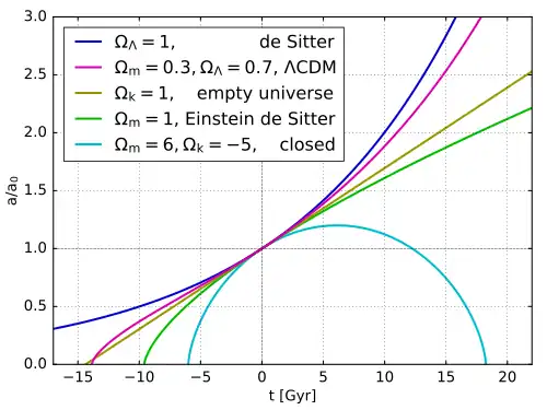 The age of the universe can be determined by measuring the Hubble constant and extrapolating back in time with the observed value of density parameters (). Before the discovery of dark energy, it was believed that the universe was matter-dominated (Einstein–de Sitter universe, green curve). The de Sitter universe has infinite age, while the closed universe has the least age.