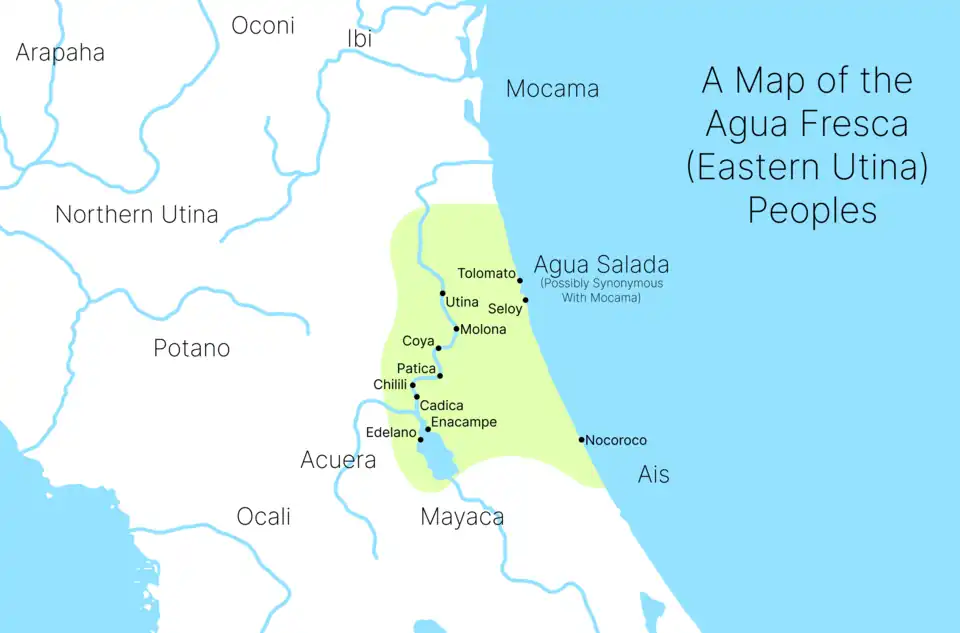 Agua Dulce or Agua Fresca (both meaning "Freshwater") was a Spanish term for Timucua living along the freshwater lower St. Johns River, as opposed to the Mocama or "Salt Water" who lived along the coast.[1] The Utina chiefdom of the late 16th century is so called after its paramount chief at the time of contact with the Europeans, Olata Ouae Utina; other spellings of the name include "Outina". The name "Utina" does not appear to be a designation specific to this group; uti-na means "my land" in Timucuan.[2] The Saturiwa, another Timucua chiefdom who were enemies of the Utina, called them "Thimogona" or "Tymangoua", which is possibly the origin of the name "Timucua".[2] The French followed the Saturiwa in this use, but later, the Spanish used the word "Timucua" for a much wider area of northern Florida, which they incorporated into their mission system as the Timucua Province.[2]