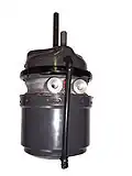 An air brake or, more formally, a compressed-air-brake system, is a type of friction brake for vehicles in which compressed air pressing on a piston is used to both release the parking/emergency brakes in order to move the vehicle, and also to apply pressure to the brake pads or brake shoes to slow and stop the vehicle. Air brakes are used in large heavy vehicles, particularly those having multiple trailers which must be linked into the brake system, such as trucks, buses, trailers, and semi-trailers, in addition to their use in railroad trains. George Westinghouse first developed air brakes for use in railway service.[1] He patented a safer air brake on March 5, 1872.[2][3] Westinghouse made numerous alterations to improve his air pressured brake invention, which led to various forms of the automatic brake. In the early 20th century, after its advantages were proven in railway use, it was adopted by manufacturers of trucks and heavy road vehicles.