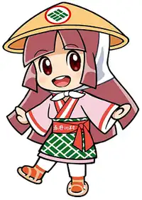 Akaigawa's mascot is Akarin (あかりん), a 10-year-old farmer girl who is active day and night either through sports or farming. Her favourite food is a mixture of fresh produce and rice. She usually ends her sentences with "desu no" (ですの) which, along with her eyes, are her charm points. She became the mascot on 18 July 2014.[5]