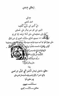 Akhlak E Hindi (Urdu: اخلاق ہندی) is the first Urdu book printed in printing-press in 1803. The book was written by Mir Bahadur Ali Hussaini and deals with ethics.[1]